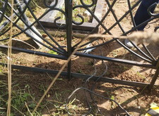 Предварительно убрав уже выросшие сорняки, мы привариваем к ножкам ограждения металлическую полосу. Она обозначает периметр участка и препятствует высыпанию крошки за его пределы.
